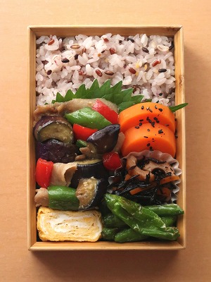 本日の弁当: 豚肉と茄子ピーマンの味噌炒め → 人参の甘煮 → 芽ひじきとちくわの炒め煮 → ししとうの素揚げ →···