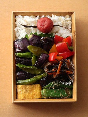 本日の弁当: 茄子とししとうの揚げびたし → パプリカの浅漬け 芽ひじきとちくわの炒め煮 → オクラの胡麻和え → 玉···